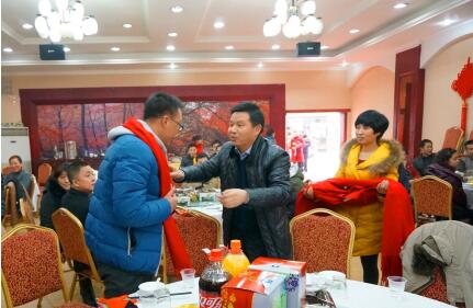 在寒冷的冬季,员工的冷暖时刻牵挂着公司领导的心。2014年1月27日天门纺织机械有限公司董事长沈方勇、武汉银桥南海光电有限公司董事长王先炎、武汉银桥科技有限公司总经理师雅并一行,在公司新春团拜会上给每个员工佩带上一条条代表吉祥的红围巾。这种献爱心送温暖的活动,让丝丝温暖汇聚起爱的洪流,即温暖了每个员工的心,也让公司充满了和谐的力量。